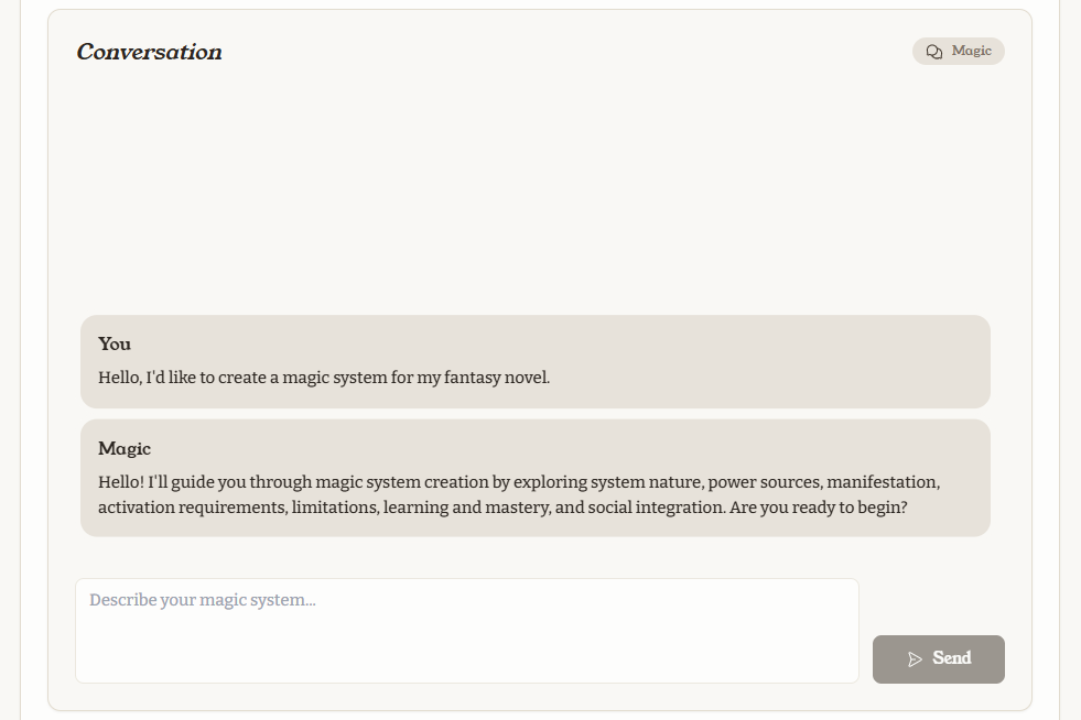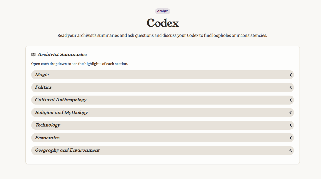 We harness AI as a guide, not a replacement for your creativity. Our seven specialists use guided conversation to help you develop, organize, and refine your own ideas across magic, politics, culture, religion, technology, economics, and geography. Our specialists ask the right questions and spot inconsistencies, but every creative decision stays with you. It's your imagination, organized and amplified by smart tools.
